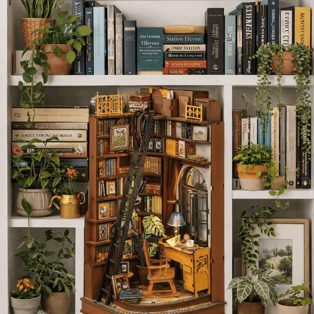 Inséré dans une bibliothèque blanche entourée de livres et de plantes, ce book nook devient une véritable pièce maîtresse décorative. Il attire immédiatement le regard et transforme une simple étagère en un univers miniature captivant.