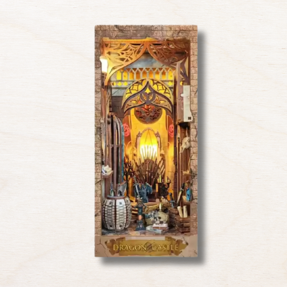 Contrairement à de simples objets décoratifs, les dioramas apportent une profondeur visuelle. Le book nook dragon donne l’impression que votre bibliothèque cache un passage secret vers un château médiéval, un donjon mystérieux ou une salle de throne éclairée de flammes.